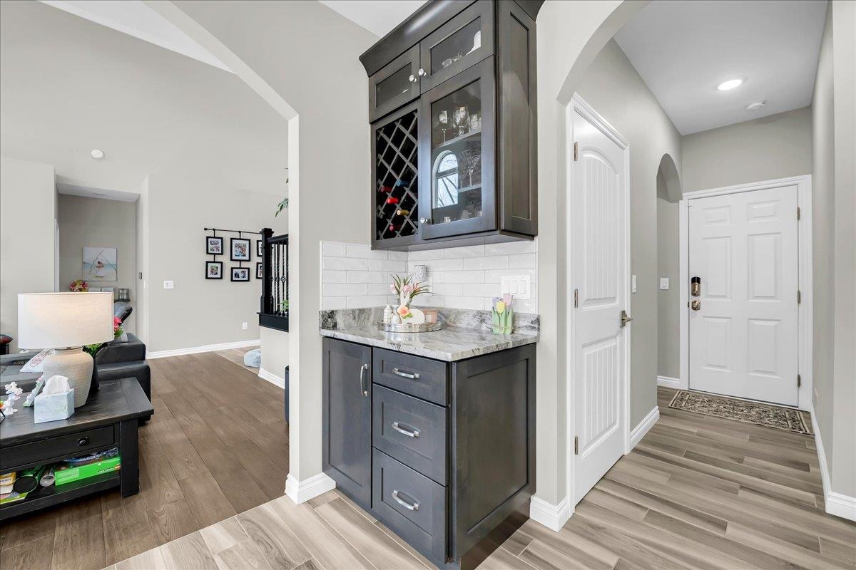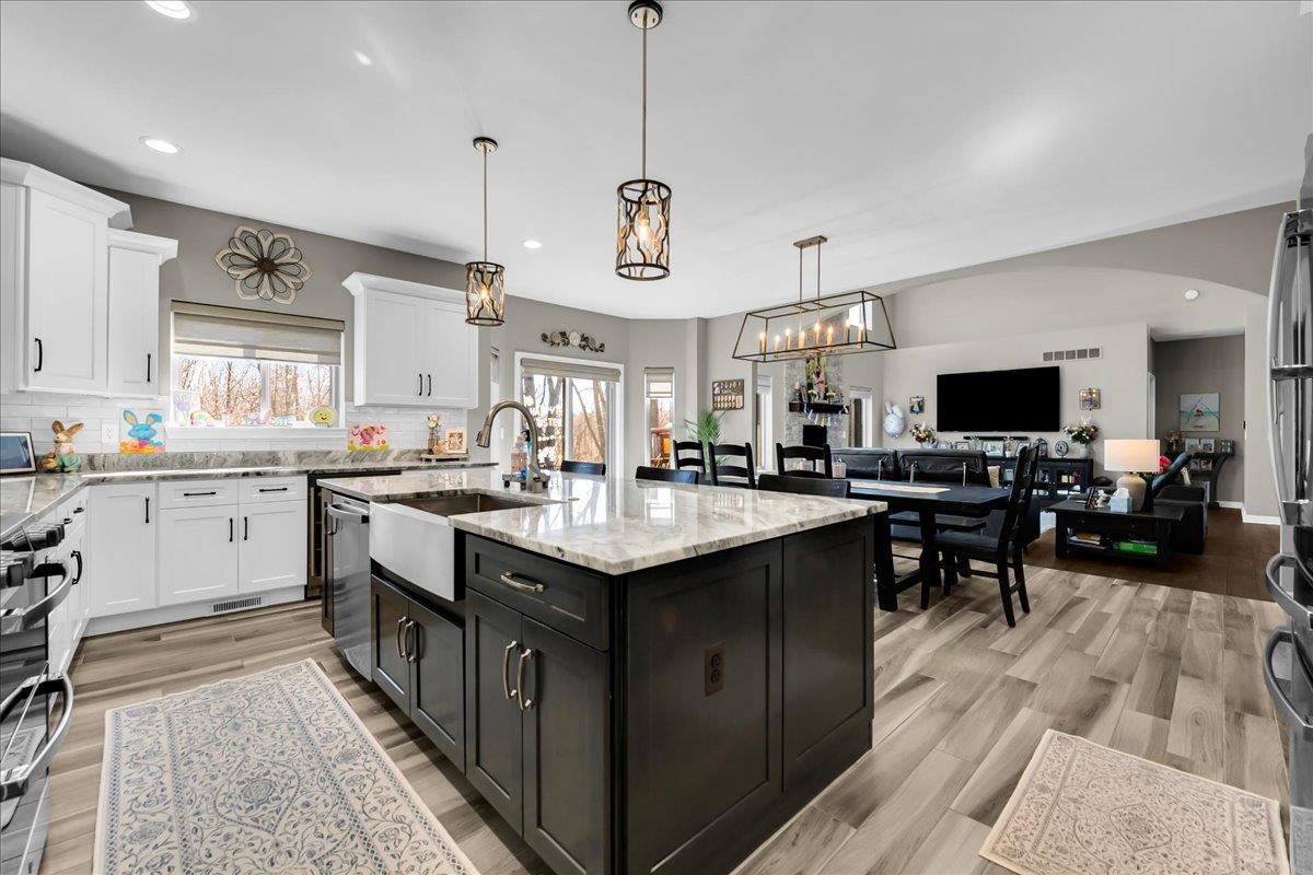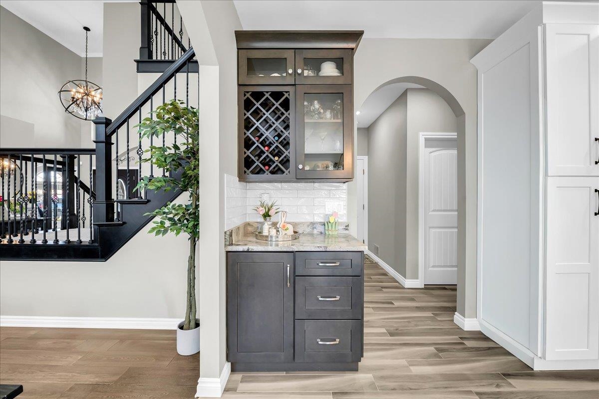 Built in 2021 with no expense spared, this exceptional home has been extensively upgraded well beyond builder grade. Situated on a premium lot backing up to protected wetlands, enjoy a private, park-like setting with no rear neighbors. Highly desirable first-floor primary suite offers convenience and privacy, while cathedral ceilings, custom iron spindle staircase and balcony, and high-end finishes throughout elevate the entire home—including upgraded lighting, fixtures, hardware, sinks, faucets, and new stainless steel appliances. Major mechanical upgrades completed by a professional electrician include a fully redesigned, high-efficiency, oversized heating and cooling system engineered for maximum performance and long-term efficiency. The recently finished basement is a true showpiece—featuring luxury vinyl plank flooring, full tile bathroom, electric fireplace with stone feature wall, expansive living area, and an oversized quartz bar with water hookup, wine cooler, and beverage cooler—perfect for entertaining. Exterior highlights include exposed aggregate concrete, 220 line ready for a hot tub, extensive custom outdoor lighting, whole house generator, and a heated 3-car garage. Truly turnkey with upgrades throughout and one of the best lots in the area.